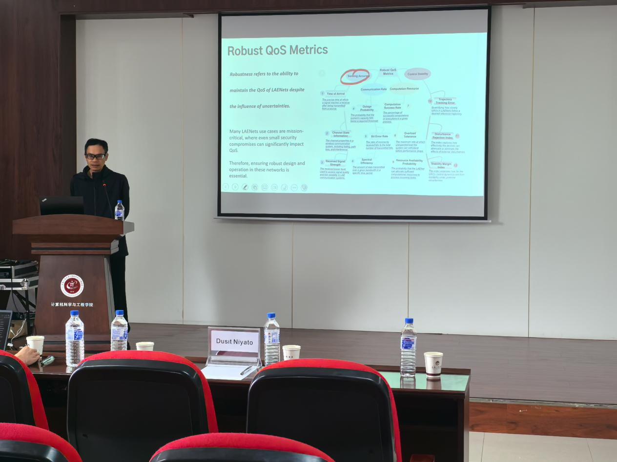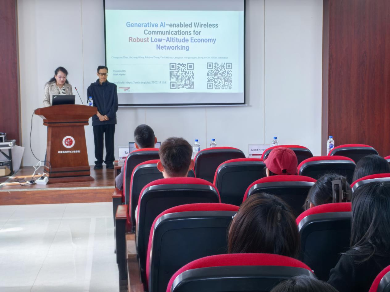 校长讲席教授、IEEE Fellow Dusit Niyato作专题演讲。Dusit教授分享了生成式AI在低空通信网络中的前沿应用,并与现场师生就分布式机器学习、边缘智能等技术挑战进行了交流。本次活动为电子平台