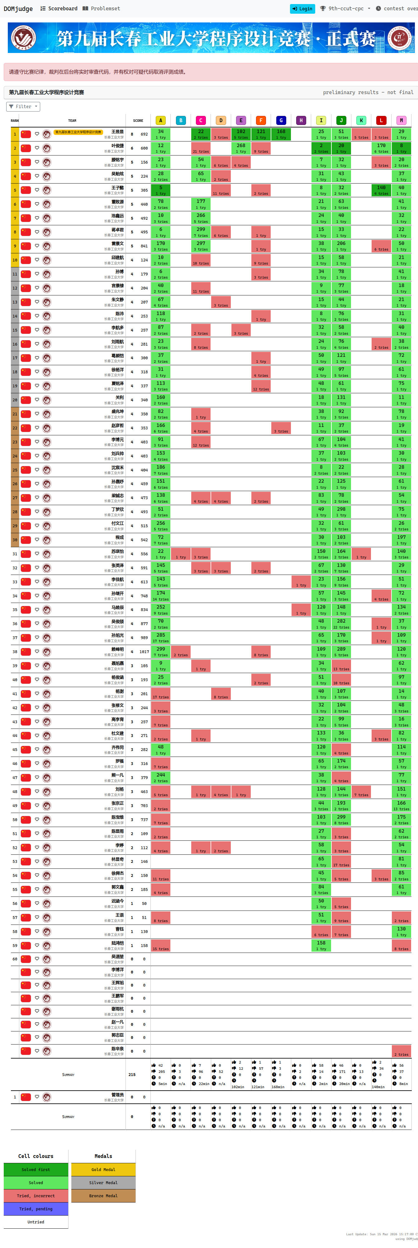 等9个院系共69名同学参加。比赛开始后,选手们面对一道道兼具挑战性与实战性的赛题,他们或凝神思考拆解算法逻辑,或专注调试攻克代码难关,展现出严谨的逻辑思维、扎实的专业功底和迎难而上的拼搏精神。经过5个小时的激烈角逐,比赛于下午2点圆满落幕。裁判团队第一时间开展题解和滚榜环节,最终,王昱显等30余名同学获得金、银、铜奖。